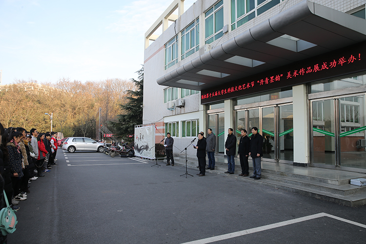 12月18日,我校第十五届大学生科技文化节“丹青墨韵”美术作品展开幕式在艺术楼门前隆重举行。校党委宣传部部长丁少锋,学工部部长岳宗德,教务处副处长祁传达,研究生处处长李全亮,校团委书记王建旭,美术学院党委书记周子良、副书记李孝民,各院系教师代表及百余名学子共同参加了开幕式。开幕式由李孝民主持。 开幕式上,李孝民首先介绍了出席嘉宾,并对beat365官网承办本次活动表示感谢。随后,丁少锋致开幕词,对各单位的积极配合与众位师生的踊跃参与表示衷心感谢,并预祝“丹青墨韵”美术作品展取得圆满成功。开幕式结束后,众人共赴展厅欣赏优秀作品。