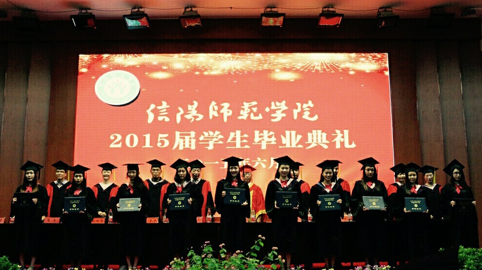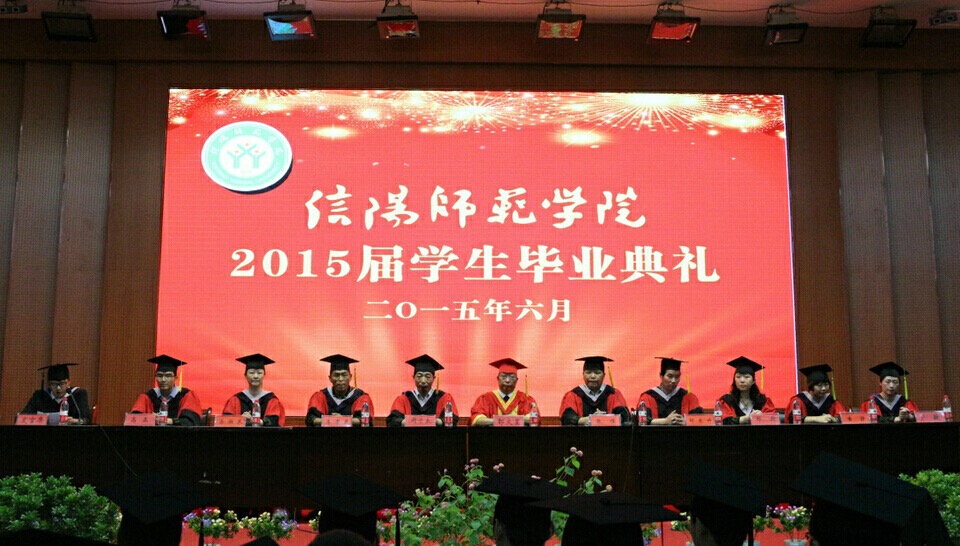 毕业典礼开始前播放老师和同学们的寄语视频,每个人都在衷心的祝愿着,感动了在场的所有人。副院长张伟宣布典礼正式开始。美术学院学位委员会副主任委员邹东升副院长宣读信阳师范学院关于授予2015届毕业生学士学位的决定。