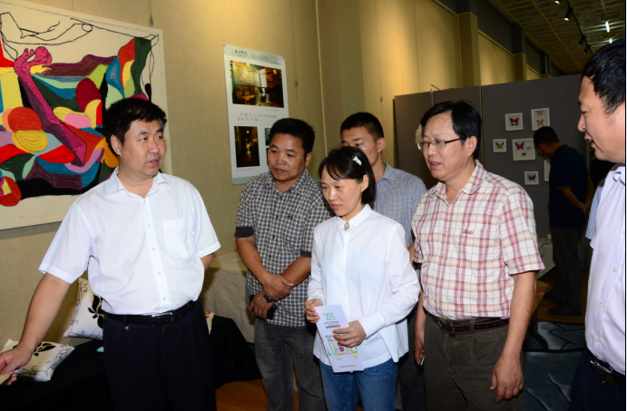 在艺术楼展厅,结合展出的专业转型成果,美术学院院长刘根货教授向专家组一行介绍美术学院专业转型的创新育人方式:一是强化实践育人,结合实际不断优化人才培养体系,根据专业特色修订应用型人才培养方案,完善应用型课程体系,构建“三课堂”联动的实践教学体系,完善大学生创新创业教育服务体系;二是深化校企合作,利用校友及专业教师创办的企业资源,大力加强实践教学平台和基地建设,整合提升实验教学平台,合作共建校内实训基地,加强校外实习实训基地建设;三是坚持引培并举,努力推动“双师型”教师队伍建设,美术学院设计专业全体专任教师全部考取相关职业资格;四是着力建设中原书画协同创新中心等,协同共建应用型科研平台,积极开展区域文化资源挖掘研究,大力促进研究成果转化。