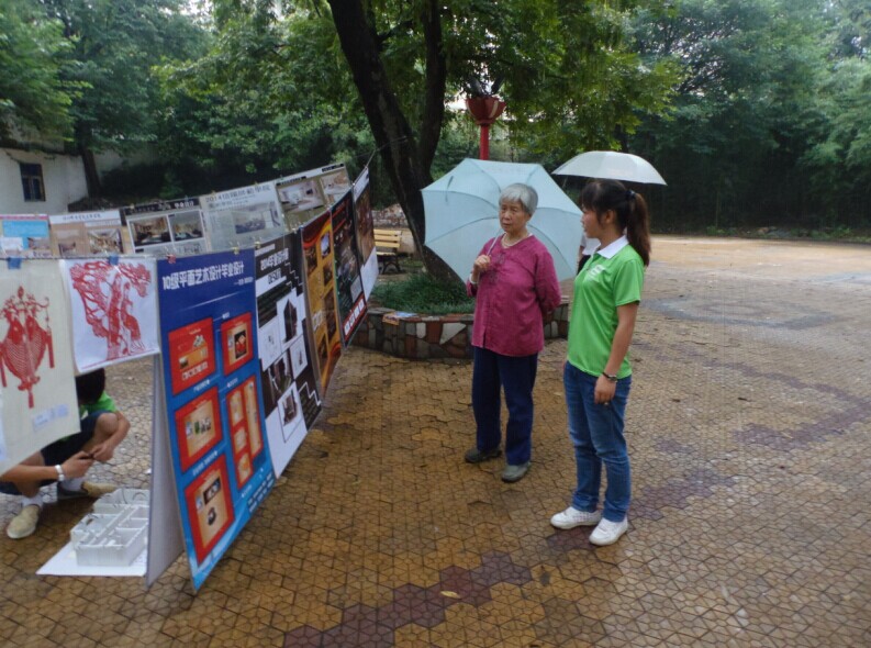 本次展览依托beat365官网参加河南省第十四届科技文化艺术节中绘画、摄影、篆刻、书法、设计等优秀作品,结合beat365官网2014年毕业生优秀毕业作品,实践小组成员充分利用各种资源,在浉河公园进行展览、讲解,并进行现场绘画、书法等活动,现场群众踊跃参观,现场观众络绎不绝,气氛热烈。之后进行的字画赠送活动使小组成员与群众充分互动,beat365官网学生现场作画、写字,赠与围观群众。雅致的山川水墨画,遒劲的行书楷书,得到现场观众的一致好评和热烈掌声。