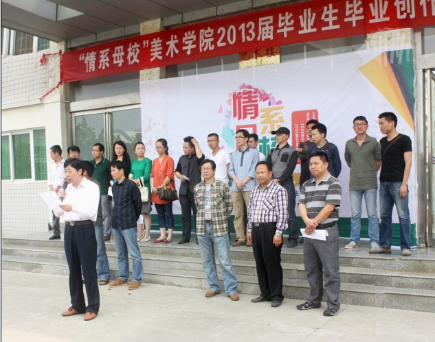 5月20日,由美术学院主办,2009级美术学班、2009级艺术设计1班、2009级艺术设计2班承办的“情系母校”2013届毕业生毕业创作汇报展于艺术楼前隆重开幕。校人民武装部部长、学生处副处长赵明民,美术学院院长刘根货,党总支书记周子良,党总支副书记李孝民,副院长张伟、邹东升等领导老师和美术学院2013届全体毕业生共同参加了开幕式。