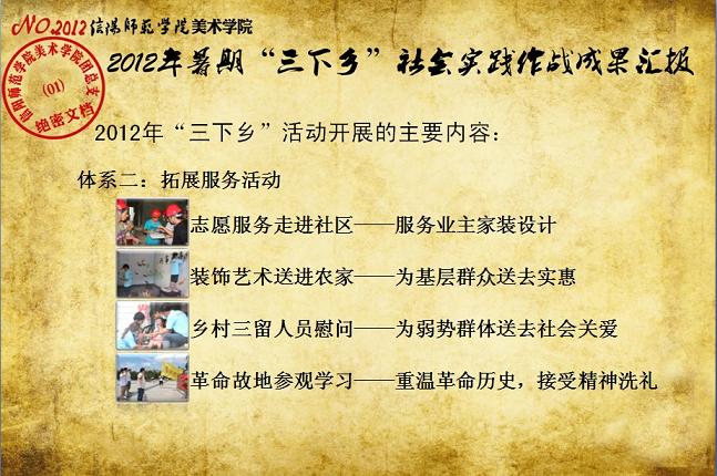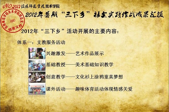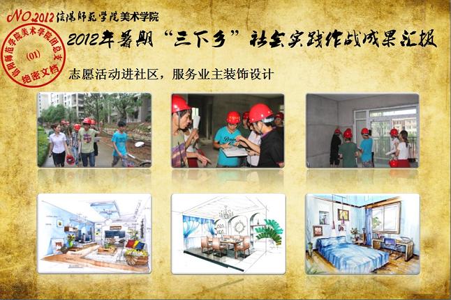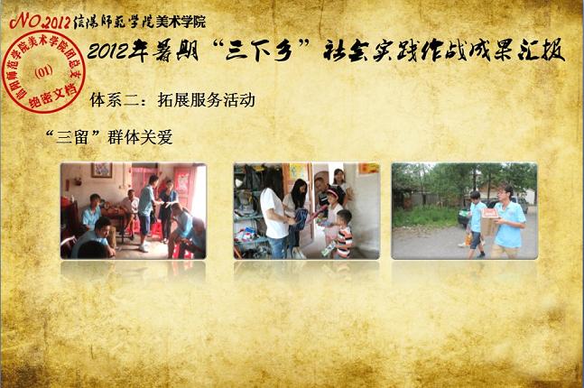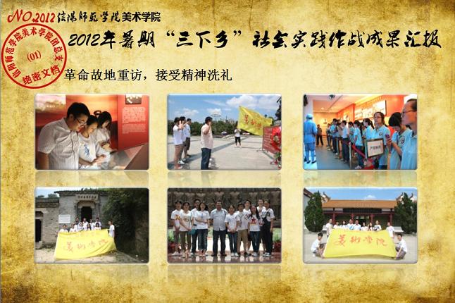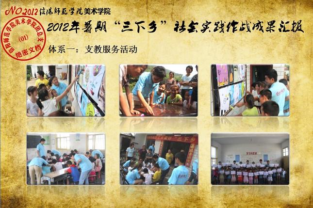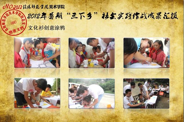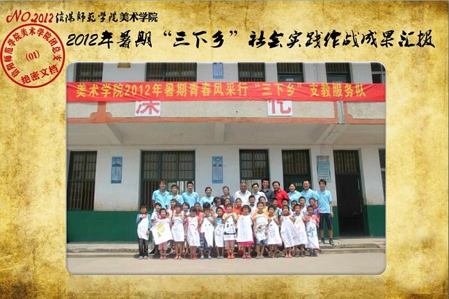 日前,我校《关于表彰信阳师范学院2012年大学生暑期“三下乡”社会实践活动先进集体和先进个人的决定》下达,beat365官网2012年大学生暑期“三下乡”社会实践志愿服务队再次获评校“大学生暑期‘三下乡’社会实践活动先进集体”荣誉称号,志愿队一支队队长刘毅(2010级环境艺术设计班)同学获评“2012年河南省大中专学生暑期‘三下乡’和‘四进社区’实践教育活动先进个人”荣誉称号,齐东伟、周贤亮老师获评校“2012年大学生暑期‘三下乡’社会实践活动先进工作者”荣誉称号,陆杨等17名同学获评校“2012年大学生暑期‘三下乡’社会实践活动先进个人”荣誉称号。大学生暑期“三下乡”社会实践活动是高校实践育人的一个重要环节,是当代青年大学生深入基层、实践基层、服务基层,全面地了解社会、锻炼自我、促进自身成长与发展的一个有效平台。多年来,美术学院结合自身专业特色,将思想政治教育、专业技能实践、责任意识培养全面融入大学生暑期“三下乡”社会实践活动,形成了一系列广受社会欢迎和学校认可的特色品牌活动,2005年至今,美术学院已6次获评校大学生暑期“三下乡”社会实践活动先进集体。2012年暑期,美术学院团总支紧紧围绕“高举团旗跟党走、建功中原经济区”这一主题,结合“以支教服务为中心,充分发挥专业特色及队员特长,在扎实开展支教服务活动的同时,拓展性地开展各类有利于留守儿童情感关爱、有利于乡村基层文化建设、有利于青年学生思想成长的‘三下乡’志愿服务活动”的工作主线,组织志愿队员30余人,分两个支队分赴信阳市浉河区南湾村、信阳市建业森林半岛社区、信阳市光山县陈岗村小学、信阳市光山县刘邓大军王大湾会议旧址、信阳市新县鄂豫皖苏区革命纪念馆、信阳市新县浒湾乡等地开展了革命故地参观学习、艺术支教服务、志愿服务走进社区、装饰艺术送农家、“三留”人员情感关爱等一系列服务内容丰富、专业特色突出、教育主旨鲜明、服务成效显著的社会实践活动,受到了服务地干群的一致欢迎和认可。活动同时更得到了广大社会媒体的关注和支持,中新网、中原网、青年导报等多家新闻媒体对beat365官网志愿队开展的一系列志愿服务活动进行了全面的宣传报道。