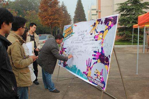 11月10日,由信阳师范学院团委、信阳师范学院美术学院、信阳农业高等专科学校团委、信阳职业技术学院团委主办,信阳师范学院大学生美术爱好者协会承办的2012“展望信阳”喜迎十八大信阳大学生涂鸦大赛总决赛在信阳师范学院艺术楼前隆重举行。信阳师范学院、信阳农业高等专科学校、信阳职业技术学院、信阳师范学院华锐学院四所高校的团委负责老师及社团指导教师应邀参加了此次大赛的开幕式和作品评审,来自上述四所高校的200余名选手入围参加了此次总决赛。