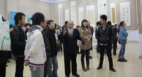 信阳市浉河区书法家协会会长吕玉中展出现场与同学们进行书画经验交流
