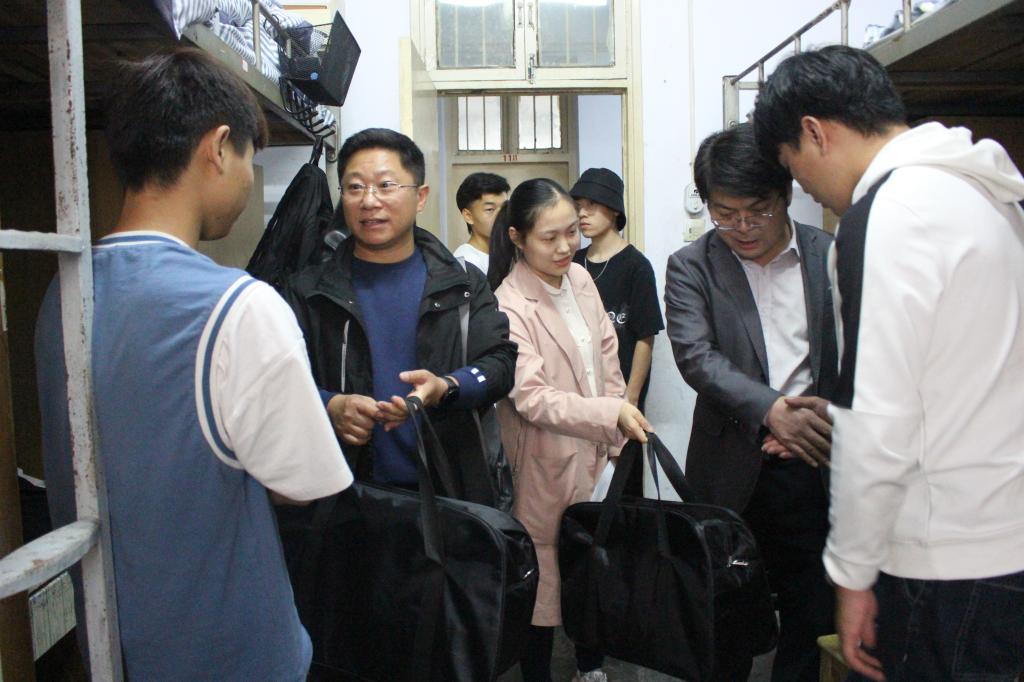 在走访过程中,朱四倍首先对新生表示热烈的欢迎,对同学们表示亲切慰问,他详细询问了大家的衣食住行情况,鼓励同学们要积极适应大学生活,做好大学规划,好好学习,多读书,共同度过美好的大学生活。期间学院领导为家庭经济困难学生发放了爱心大礼包。杨轶中提醒同学们要提高防范意识,注意人身安全,对存在的校园安全隐患情况进行了详细说明,他强调大家要和谐相处,互帮互助,处理好寝室关系,营造良好的宿舍氛围,学习和生活中遇到困难及时跟辅导员班主任联系。同学们纷纷表示一定会努力学好专业知识,不辜负美好的大学时光。