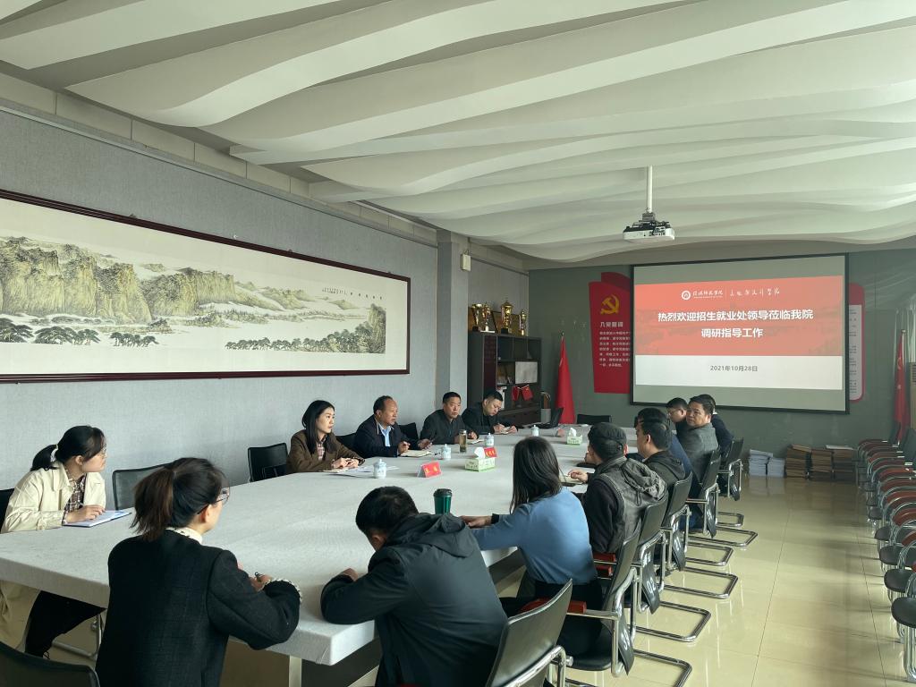 10月28日上午,招生就业处处长赵明民、副处长兼大学生就业创业指导中心主任王松亭、副处长张楠、招生工作办公室张俊杰莅临beat365官网调研指导招生就业工作。学院领导班子,全体辅导员、毕业生班主任参加会议。会议由党委书记兰洋主持。