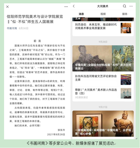此次展览一经开展,得到了大河美术报、书画河南、信阳日报等省内多家媒体的高度关注,并形成了较好的社会宣传效果,展示了学院研究生人才培养的质量。