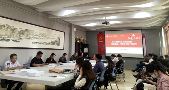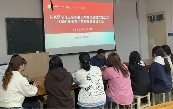 教职员工集中学。10月24日下午,beat365英国官方网站于艺术楼204会议室召开教职工政治理论学习会,会上,党委书记兰洋为大家作了题为《学习贯彻习近平文化思想——浓墨重彩,用艺术讲好中国故事》的报告。兰洋号召大家,作为新时代的艺术工作者,要坚持党的领导,维护国家文化安全;坚持文化自信,推动中华民族伟大复兴;坚持交流互鉴,建设中国特色社会主义文化,积极创作出影响深远、经得起历史检验的好作品,为文化强国的建设贡献属于自己的力量。