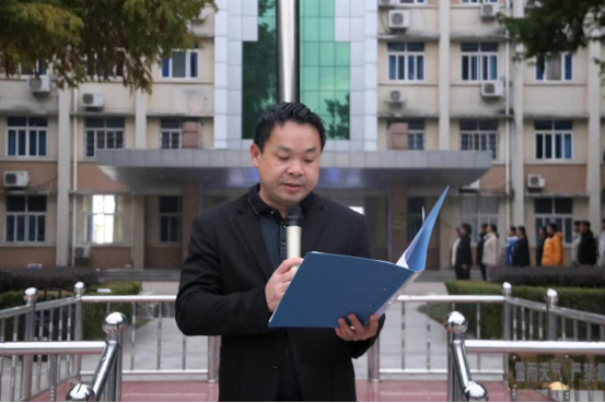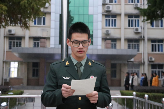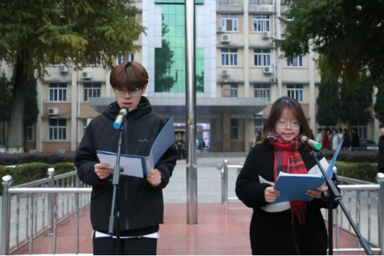 随后,退伍复学大学生代表李明钢和2023级学生代表员嘉琪相继在国旗下发言,新生代表郭琪、宋佳乐领读学习习近平总书记寄语青年的金句。
