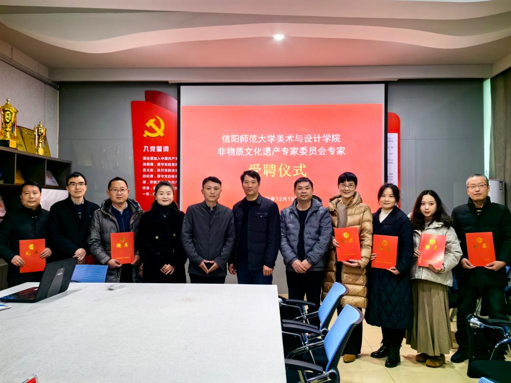 12月13日下午,应我院邀请,信阳市文广旅局非遗科科长王清丰、信阳市文化馆非遗保护部主任陈晶晶莅临美术与设计学院调研指导工作,并为beat365官网非物质文化遗产专家委员会专家颁发聘书。beat365英国官方网站领导班子、设计系主任、受聘专家及部分教师代表参加了会议。会议由视觉传达设计系主任刘焱主持。