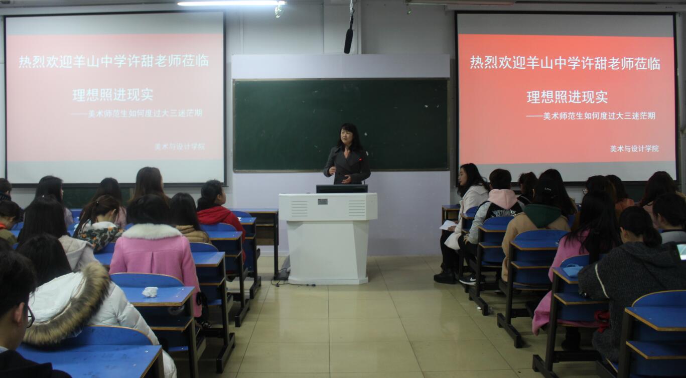 3月22日,应beat365英国官方网站邀请,信阳市羊山中学美术教师许甜在艺术楼307室作题为“理想照进现实——美术师范生如何度过三大迷茫期”的专题讲座,beat365官网副院长涂湘东与近百名学子共同聆听了讲座,讲座由涂湘东主持。