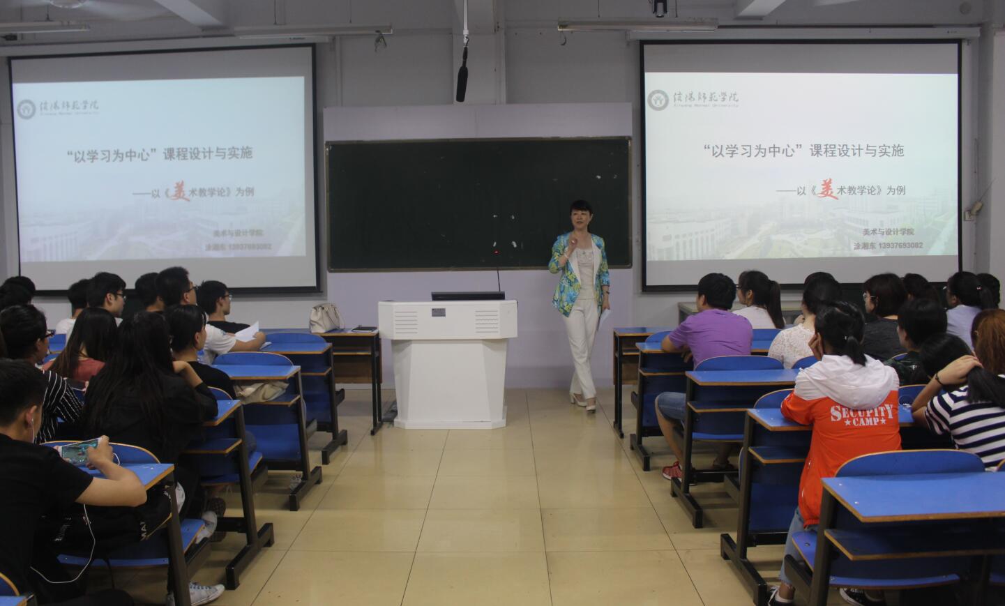 讲座围绕背景分析、课程设计、实施与效果三部分展开。讲座伊始,涂湘东为在座同学简单介绍了二十一世纪的教育问题,在国际大形势下,终身学习在全球广泛开展。之后,涂湘东重点强调了课程设计问题,并结合实例具体说明了课程内容的设计与选择、空间氛围的营造、作业与网络课程完成学习过程的监督、激发学习者潜能,调动学习者的学习兴趣等七方面内容。她表明教师可与学生进行角色互换激发学生对课堂的兴趣,提升自主学习能力。最后,涂湘东讲解了实施所取得的效果,并展示了教师文化艺术节取得的佳绩。现场气氛热烈,在场学子纷纷表示受益匪浅。