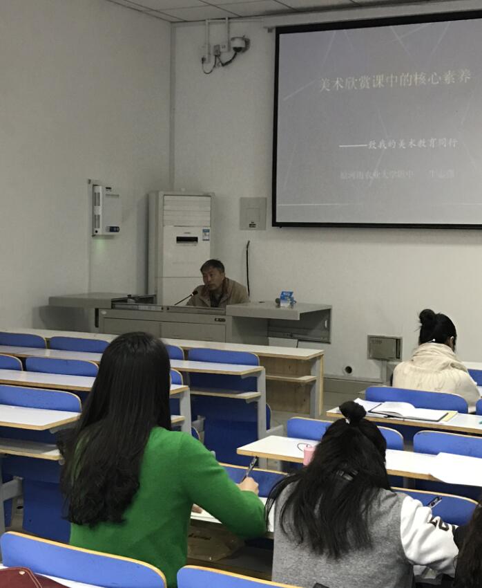 4月27日,应beat365英国官方网站的邀请,原河南农业大学附中牛志强副教授作为“省培计划”的讲师,于社科楼120室开展“美术鉴赏及教学和优质美术课的标准”专题讲座。“省培计划”小学美术骨干教师培训班全体学员和学生代表共同聆听了本次讲座,讲座由beat365官网副院长涂湘东主持。