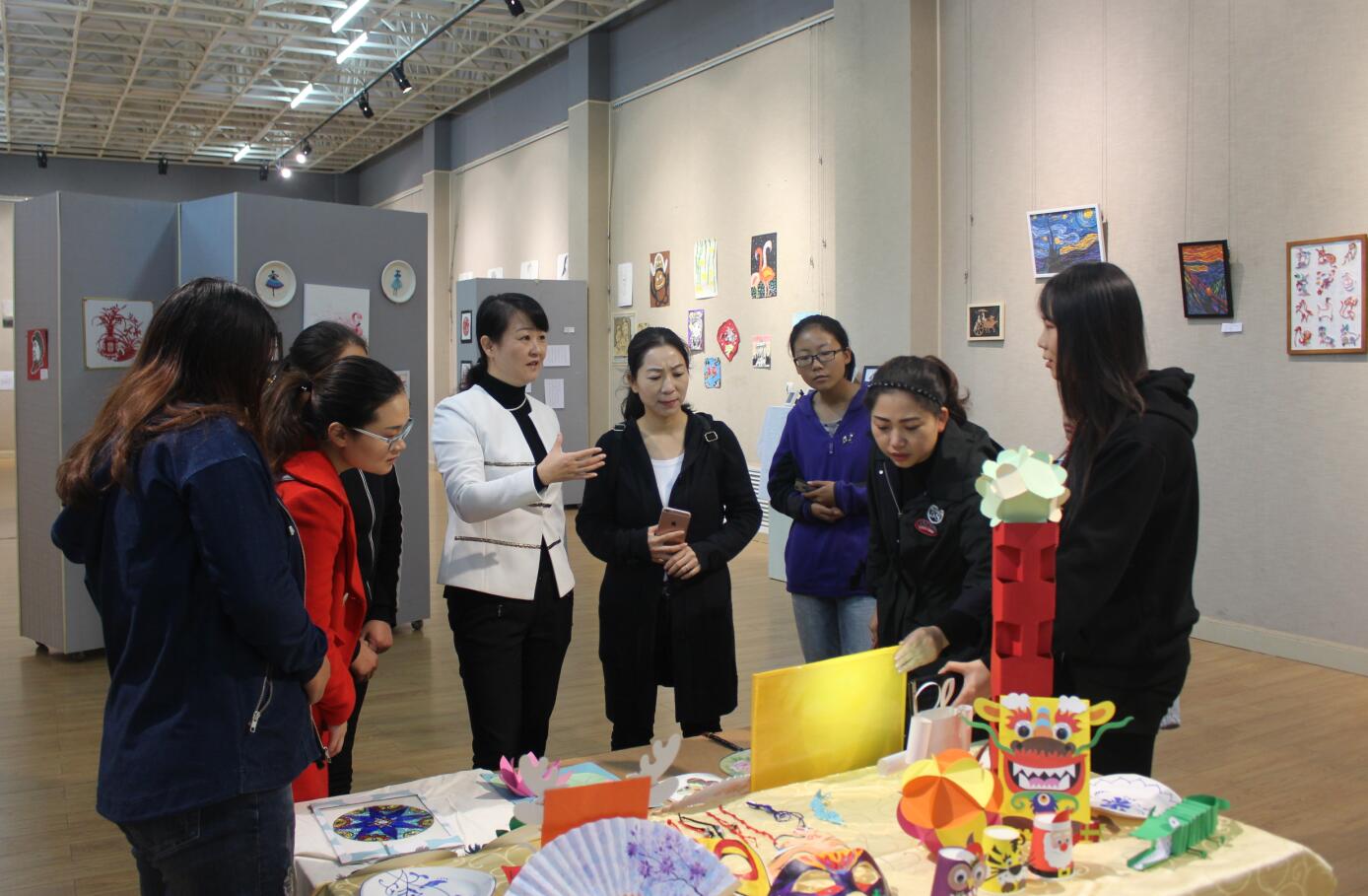 涂湘东首先为各位教师总体介绍了本次展览作品的分区,令观展教师对本次展览有了大致的了解。随后,涂湘东陪同各位教师观展,并详细介绍每件展品的技法和背后的创作历程。涂湘东表示本次展览旨在提高学生的创新能力和对教学技法的研究能力,展品多为手工制作,在针对中小学生兴趣点的同时,也更为贴近生活。她指出画展中的每一幅画,每一个线条,每一种色彩,每一个创新点,都体现了同学们丰富的想象力和生动的创造力,承载了同学们最初将教师作为梦想的执着,也记录了同学们在师院三年以来的拼搏与奋斗。沈娟等参观教师,观展过程中对作品的创新程度、精细程度赞不绝口,并对参展学生的文化底蕴和艺术创造力给予了高度评价。