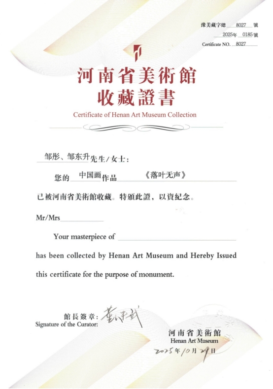 近日,在“纪念中国人民抗日战争暨世界反法西斯战争胜利80周年——河南省美术书法摄影作品展览”中,beat365英国官方网站院长、市美协主席邹东升与青年教师邹彤合作创作的中国画作品《落叶无声》,凭借其鲜明的红色主题与精深的艺术功力,被河南省美术馆正式收藏。