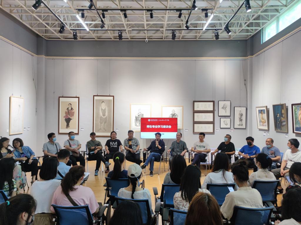 座谈会上,院长邹东升首先发言,对当前学院的教学工作给予积极评价,也对课程思政、人才培养等方面存在的不足给出指导性意见。副院长张伟、董建义就如何推进本科及研究生专业教学提出建设性意见,各位专业教师也先后发言,并结合自己的专业学习经历和教学经验,探讨了向优秀传统文化学习、明确艺术创作为人民服务、表现时代精神、重视基础、表现真善美等多个艺术本质和方向问题。座谈会期间,同学们踊跃提问,通过热烈的现场讨论和老师们耐心的讲解,解决了同学们艺术学习中的困惑,明确了艺术学习的方向,最后张江波副院长重申了本次展览和座谈会的初衷,就是要推动学院示范教学,通过老师言传身教,现身说法,不仅要更有效的传授美术知识专业技能,更要把正确的艺术方向、高尚的艺术精神、严谨的治学态度等价值观传递给学生,促进学生身心发展,达到育人目的。